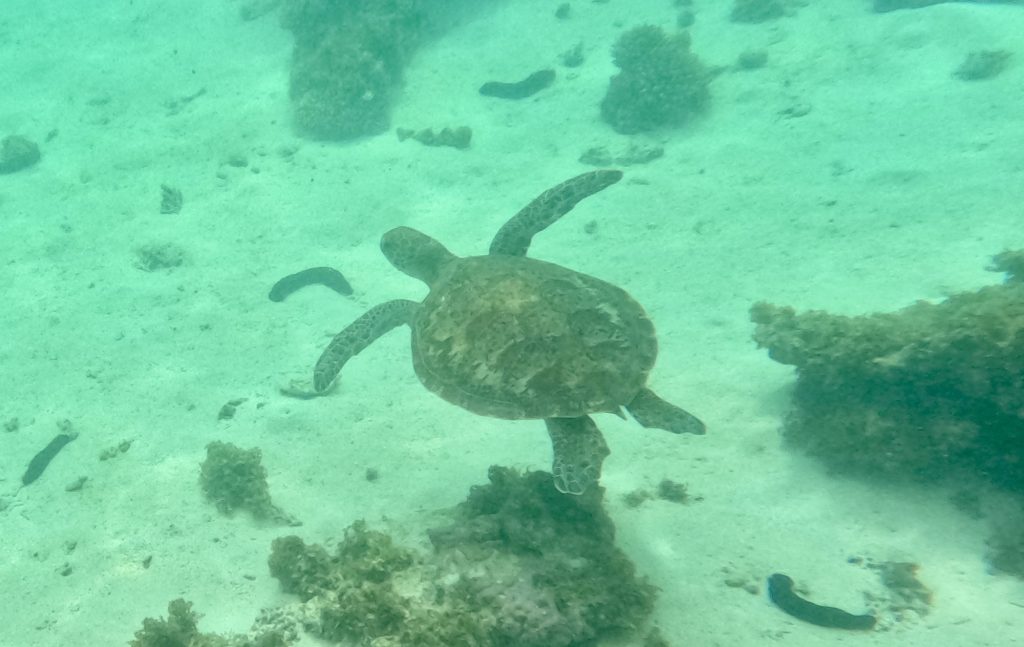 Es wimmelte heute nur vor Schildkröten. Wir sahen sie schnorchelnd im Wasser. Manchmal tauchten sie sogar unter uns hindurch.