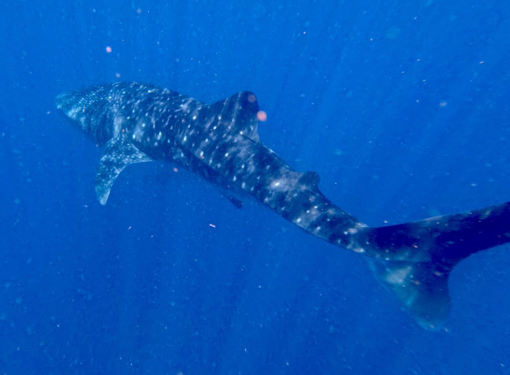 Es folgten “Stop Swimming” und “Onto the Boat”. Bald wurde allerdings vom Beobachtungsflieger ein weiterere Fisch gemeldet und diesmal durften wir zuerst ins Wasser. Diesmal war die Sicht besser. Gefühlt in Armreichweite gleitete ein 8 Meter langer Walhai an uns vorbei. Es war kaum eine Bewegung sichtbar und trotzdem bewegte er sich recht zügig. Soviel zu effizientem Schwimmen. Als die Seitenflosse uns passiert hatte durften wir mit ihm mitschwimmen. Wir mussten ordentlich Gas geben um mitzuhalten und durften ihn so über eine längere Strecke begleiten. Irgendwann tauchte er unter. Wir dachten das wars. Kurz darauf wurden wie Punkte wieder besser sichtbar und es ging weiter.