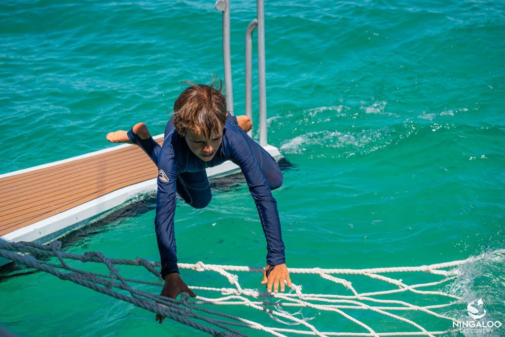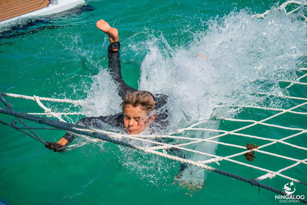 Auf dem Heimweg sahen wir noch einen ziemlich grossen Tigerhai. Schliesslich befestigte die Crew das Gepäcknetz hinten zwischen den beiden Rümpfen und warf es ins Wasser. Die Skipperin gab ordentlich Gas und wir durften uns vom Rumpf aufs Netz werfen. Gian-Marco ging in einem riesigen Sprung voran, es folgte einer nach dem anderen, am Ende hingen beinahe alle 20 Passagiere im Netz.