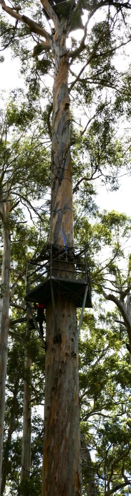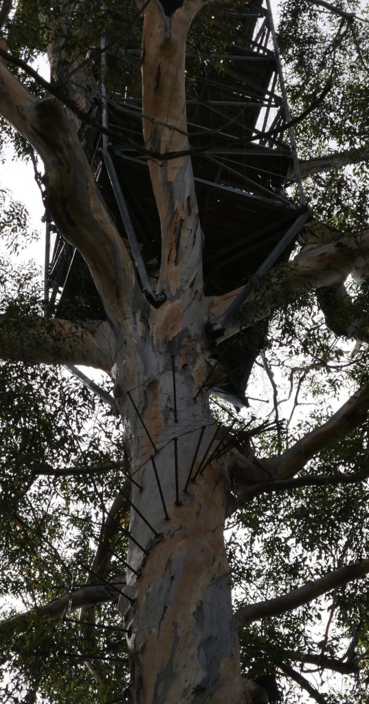 Giant Tingle Tree Anschliessend gingen wir auf einen Berg, den Mount Frankland. Erst folgten 20km Autofahrt, anschliessend war weit und breit kein Berg zu sehen. Wir folgten trotzdem dem gut ausgeschilderten Pfad und plötzlich war da mitten im dichten Wald ein ganz ordentlicher Granitmocken. 301 (oder waren es 300?) Tritte führten uns über die steile Flanke auf das Gipfelplateau. Dort hatte es ein kleines Häuschen von wo aus ein Mann die Weite der Wälder überblickt und im Falle eines Feuers mittels Peilung ein Löschflugzeug aufbietet. Der Blick von dieser Erhöhung offenbarte wie gross die Waldfläche in der Gegend ist.